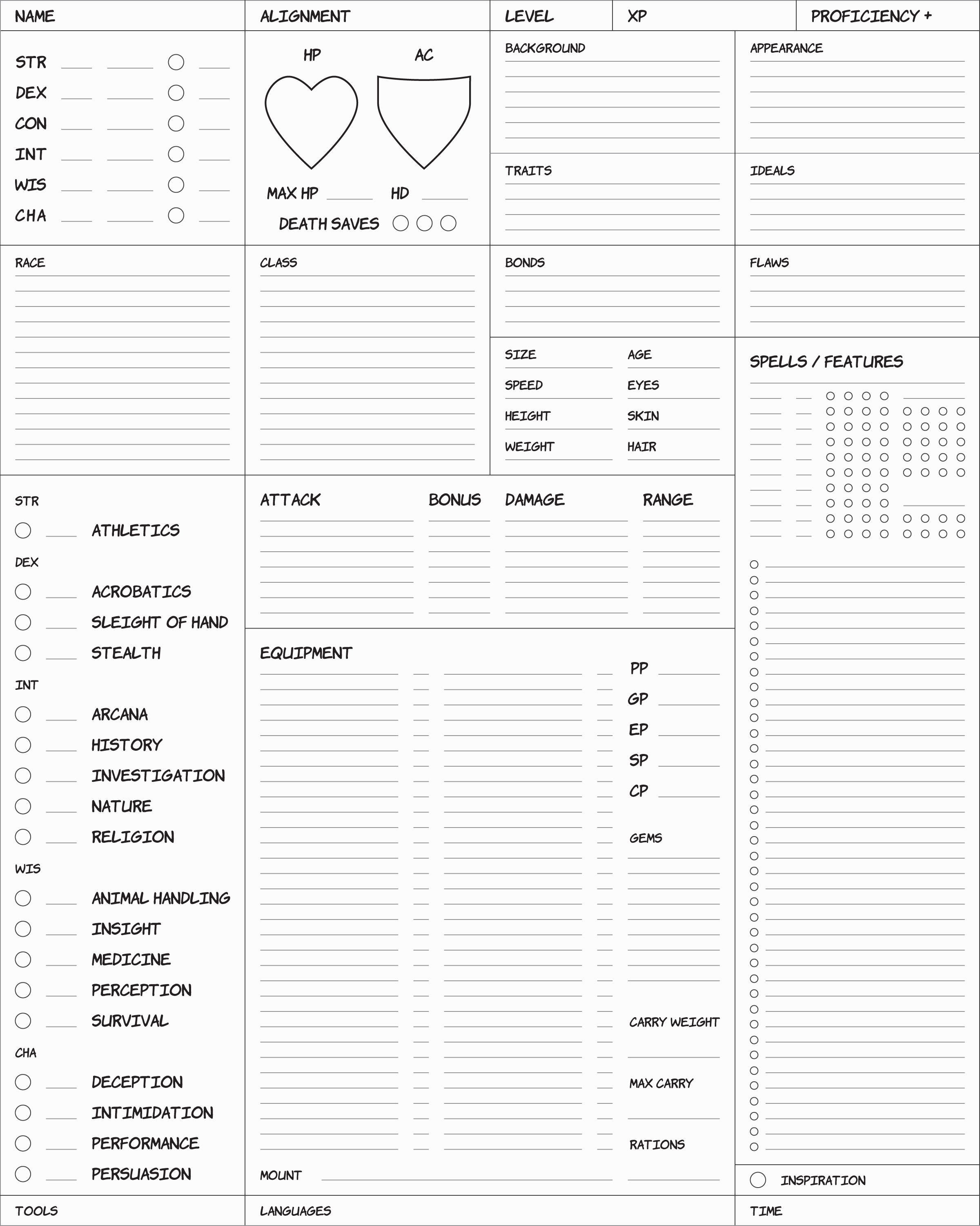Looking for more spacious 5e character sheets? Checkout my hand-drawn grid paper character sheets.